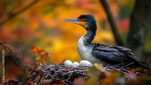 © Ashalina, Naklejka premium Cormorant bird on nest with eggs, autumn leaves background.