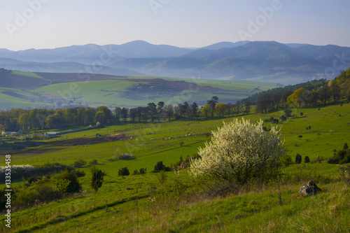 © haidamac, Fototapeta premium Corn field landscape with blossom bush on foreground
