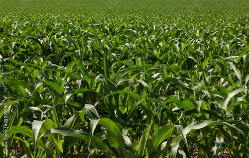 © Oleh Marchak, Fototapeta premium Corn field. Sprouts grow in rows, the future harvest on the farm. Summer, sunny weather.
