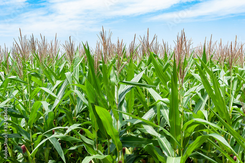 Obraz premium Corn field with flower under the blue cloudy sky