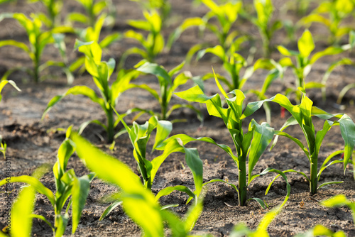 Fototapeta premium Corn field with young plants and dark fertile soil.