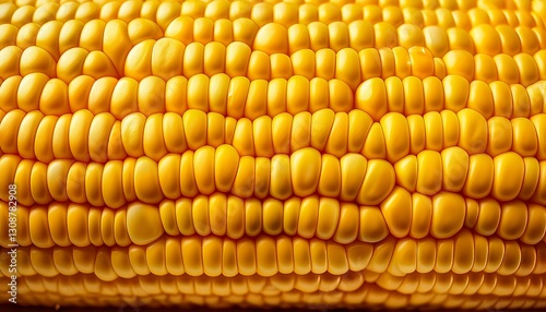 Fototapeta premium Corn kernel close-up: glossy, symmetrical yellow rows. Warm hues, perfect symmetry. Food detail, vibrant, golden.