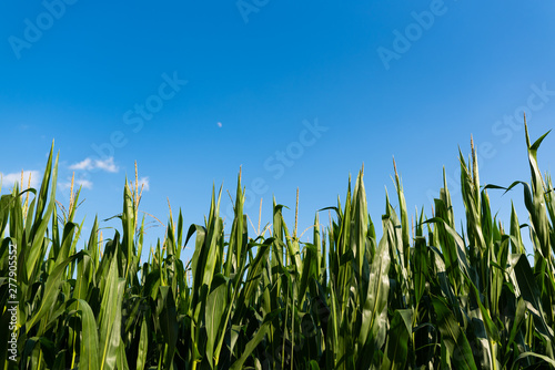 Fototapeta premium Corn (maize) field against blue sky in summer.