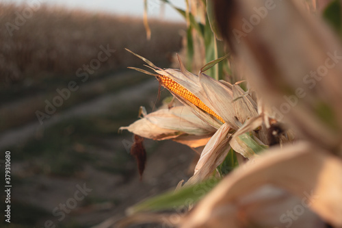 © Taras Rudenko, Obraz premium Corn on a cornfield in the evening at sunset