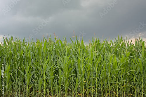 Fototapeta premium Corn plants in a field under a cloudy summer evening sky in Flanders, Belgium