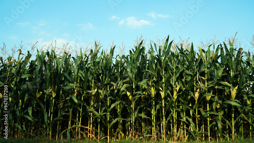 © tarasari, Fototapeta premium Corn plants in corn field, Blue sky background. Focus selected