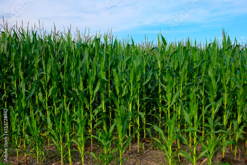 © Oleksii, Obraz premium Corn plants in focus, blue sky above.