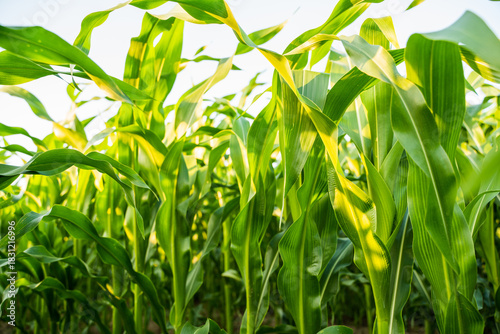 © Volodymyr_sh, Naklejka premium Corn plants with long green leaves under sunlight on bright day in agricultural field