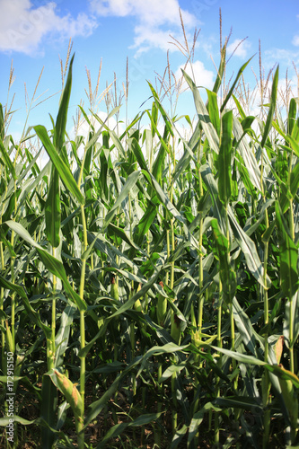 Fototapeta premium Corn stalks, leaves and flowers in a field in the summer sunshine.