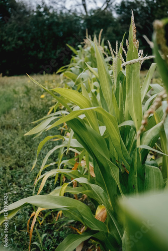 © NATALYA, Obraz premium Corn tops on a sunny day in the field. Autumn harvest.