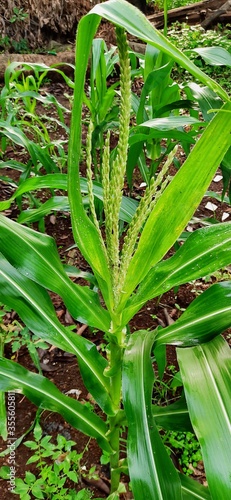 Obraz premium Corn tree flowers that begin to grow into fruit. Lush green corn trees in the...