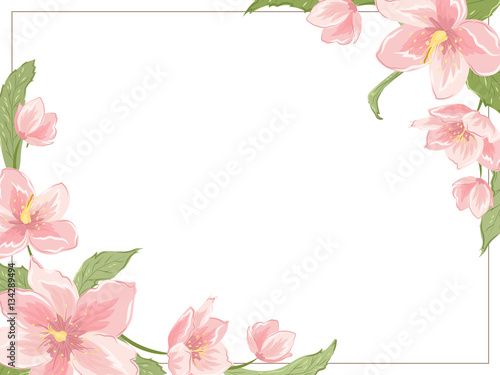 © imaginarybo, Fototapeta premium Corner frame template with sakura magnolia hellebore flowers on white background. Horizontal landscape orientation. Vector design illustration floral garland element for decoration, card, invitation.