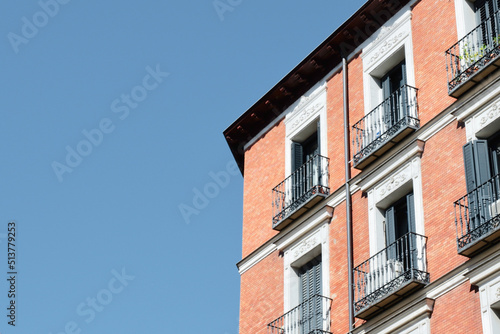 Fototapeta premium Corner of classical building made of red brick in downtown district of Madrid, Spain