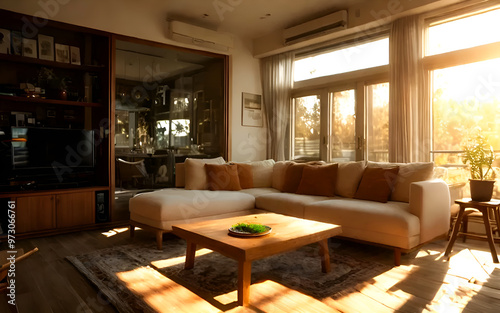 © Galina, Naklejka premium corner sofa and coffee table and large windows at sunset