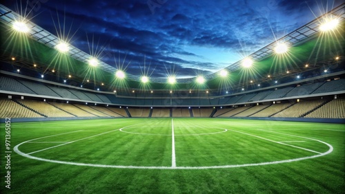 Fototapeta premium Corner view of a well-lit soccer stadium with manicured field lines