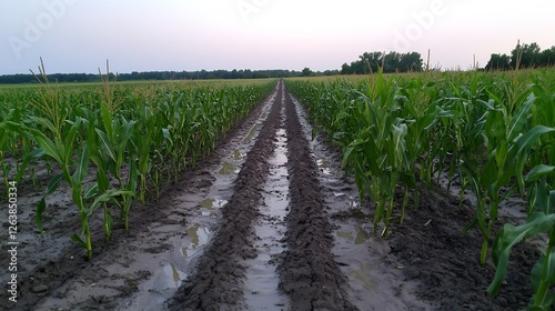 © DI, Fototapeta premium Cornfield after rain, wet paths between rows