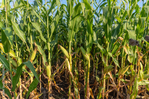 © Роман Булатов, Fototapeta premium Cornfield close-up. Young corn growing in the cornfield.