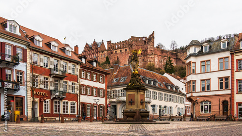 © unununius, Fototapeta premium Cornmarket, ger. Kornmarkt and Statuesque of Kornmarktmadonna in Downtown of City Heidelberg, Baden-Wuerttemberg, Germany. Europe