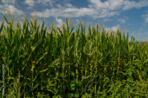 © sea and sun, Fototapeta premium corns corn field background blue sky clouds green