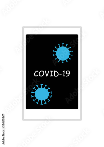 © Asha Natasha, Obraz premium Corona virus news online read at home on tablet. COVID-19 text written on black touchscreen with coronavirus drawing.