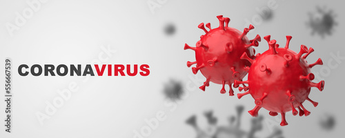 © Mikhail, Obraz premium Coronavirus 3D rendering. Realistic Covid red on a gray background. Horizontal banner, poster, website header.