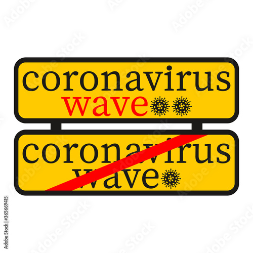 © Siarhei, Obraz premium Coronavirus end first wave and begin second wave. Warning in a rectangular sign about coronavirus. Epidemic and pandemic symbol. Bacterial infection warning sign. Vector illustration.