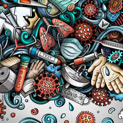 © balabolka, Obraz premium Coronavirus hand drawn vector doodles border