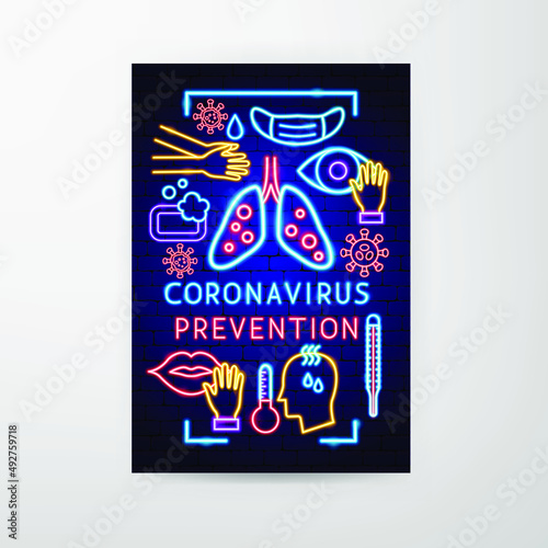 © anna_leni, Fototapeta premium Coronavirus Prevention Neon Flyer. Vector Illustration of Pandemic Promotion.