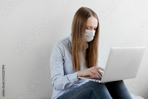 Naklejka premium Coronavirus. Quarantine. Online training education and freelance work. Computer, laptop and girl studying remotely. Coronavirus pandemic in the world. Closing schools