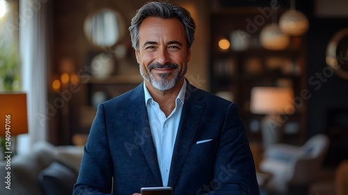 © Warakorn, Fototapeta premium Corporate director standing in contemporary office holding mobile cellphone, elegant and professional mood, copy space