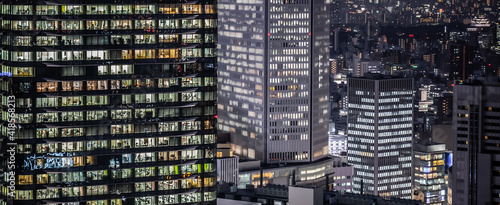 © kardd, Fototapeta premium Corporate office building at night in Osaka, Japan. Late night at work