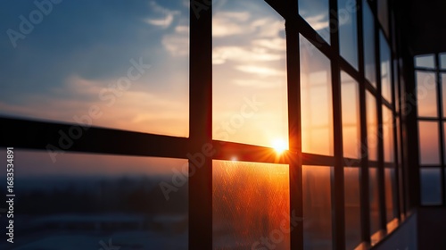Fototapeta premium Corporate office sunset view through black-framed windows with warm light and...