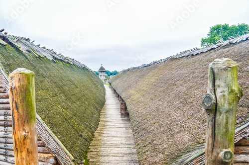 © Stefano Zaccaria, Fototapeta premium Corridor between the two main wooden huts of the Biskupin ancient village, Poland