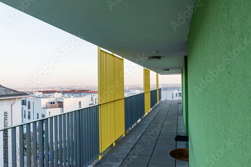 © D. Jakli, Obraz premium corridor outside of a building with colorful wall and railing