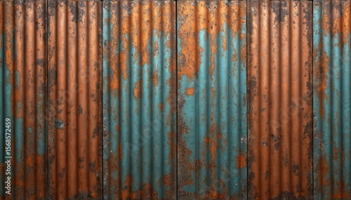 Fototapeta premium Corrugated metal sheets show oxidized copper patina with rust, wear....