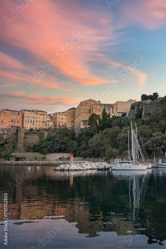 © Pascale Gueret, Fototapeta premium Corsica, Bastia, typical houses in the harbor in summer, sunset