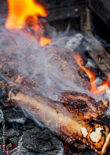 © Dionisio, Naklejka premium corte de res directo a las brasas.corte de res cowboy al estilo caveman.corte al carbón directo a las brasa estilo cavernícola