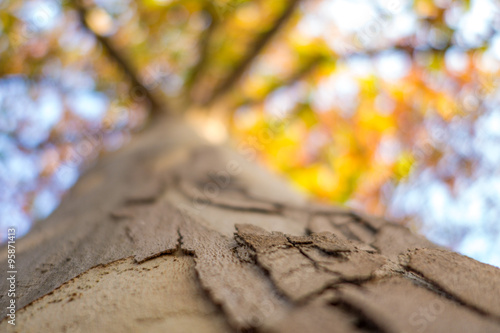 Obraz premium Corteccia di un tronco di betulla vista dal basso verso l’alto in autunno