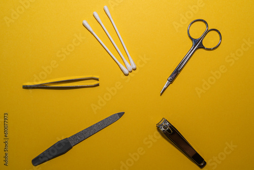 © Mentor, Fototapeta premium Cosmetic accessories with ear cleaners, scissors, nail clippers, nail file and tweezers on a yellow background