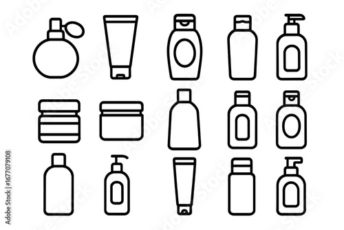 Fototapeta premium Cosmetic bottles line icon pack. Perfume, cream, shampoo, and gel outline...