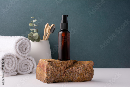 Naklejka premium Cosmetic brown bottle with dispenser in minimal bathroom interior