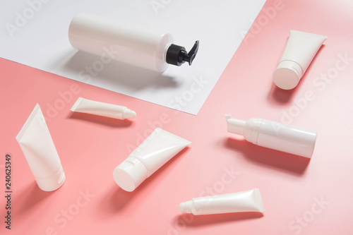 Fototapeta premium Cosmetic products collection. Blank white cosmetic bottle/tube on pink and...