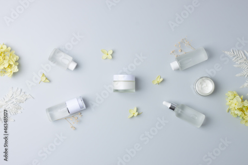 Naklejka premium Cosmetic skin care products with with flowers on grey background. Flat lay,...