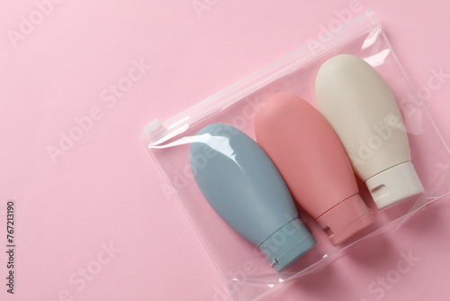 Obraz premium Cosmetic travel kit in plastic bag on pink background, top view. Space for text