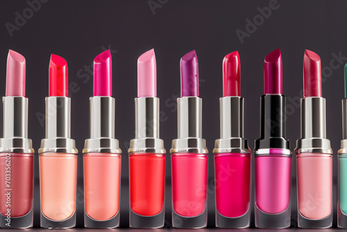© ibragimova, Obraz premium cosmetical tools. a large number of bright colored lipsticks stand in a row on a dark background, beauty concept