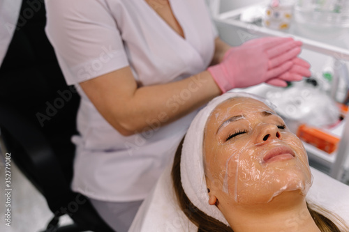 Obraz premium Cosmetician applying facial hydrogel mask. Customer of cosmetology clinic.