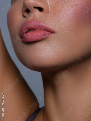 Obraz premium Cosmetics, makeup and trends. Bright lip gloss and lipstick on lips. Closeup of beautiful female mouth with natural lip makeup. Beautiful part of female face. Perfect clean skin in natural light