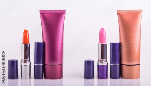 Fototapeta premium cosmetics products set on a reflective surface, featuring lipsticks and creams