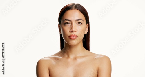 © peopleimages.com, Obraz premium Cosmetics, woman and skincare portrait in studio with natural beauty, healthy glow and hydration. Mockup space, girl or serious with dermatology on white background for collagen treatment or wellness