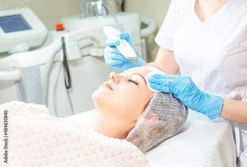 Obraz premium Cosmetology background. Cosmetologist doing ultrasound face peeling for the young woman.